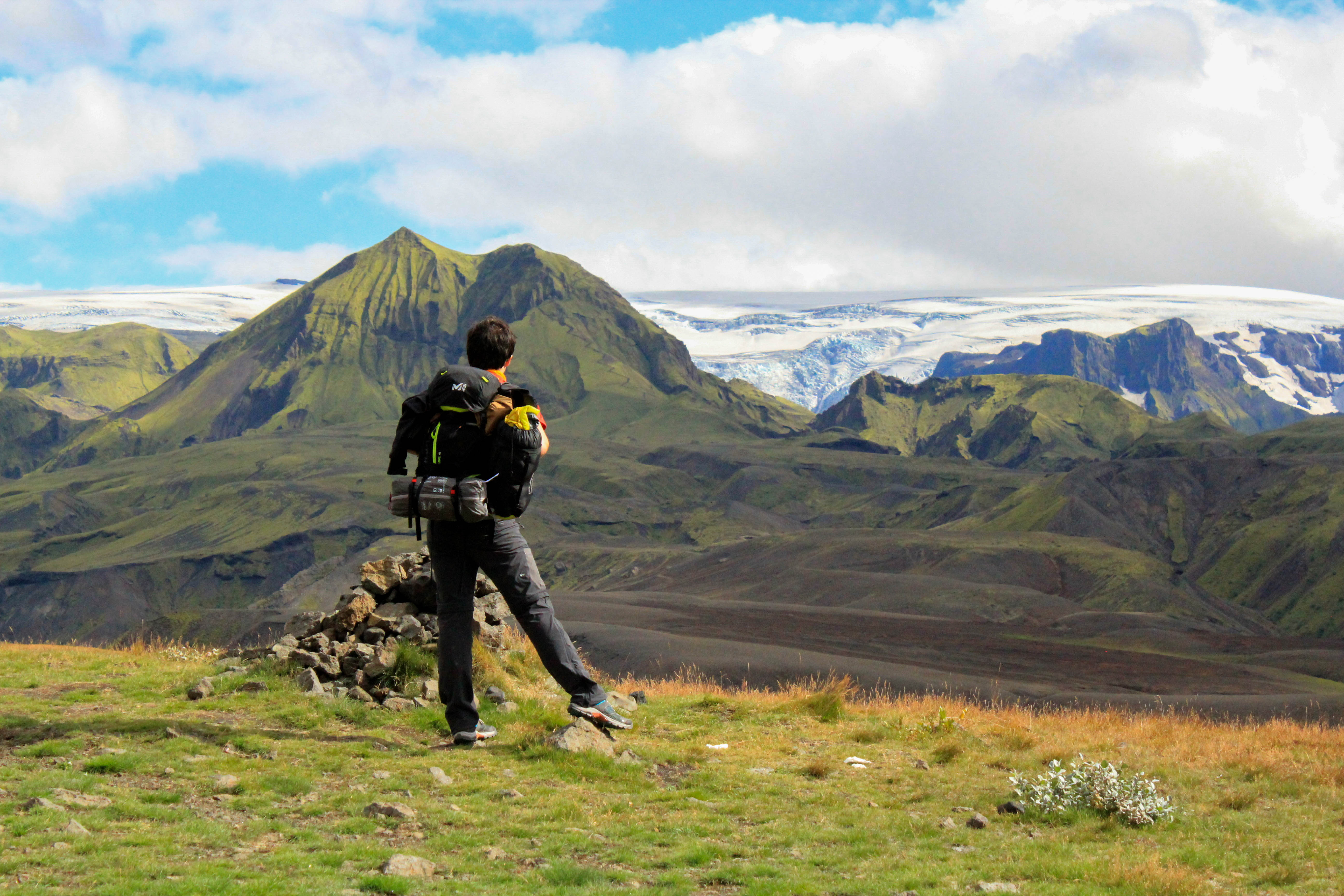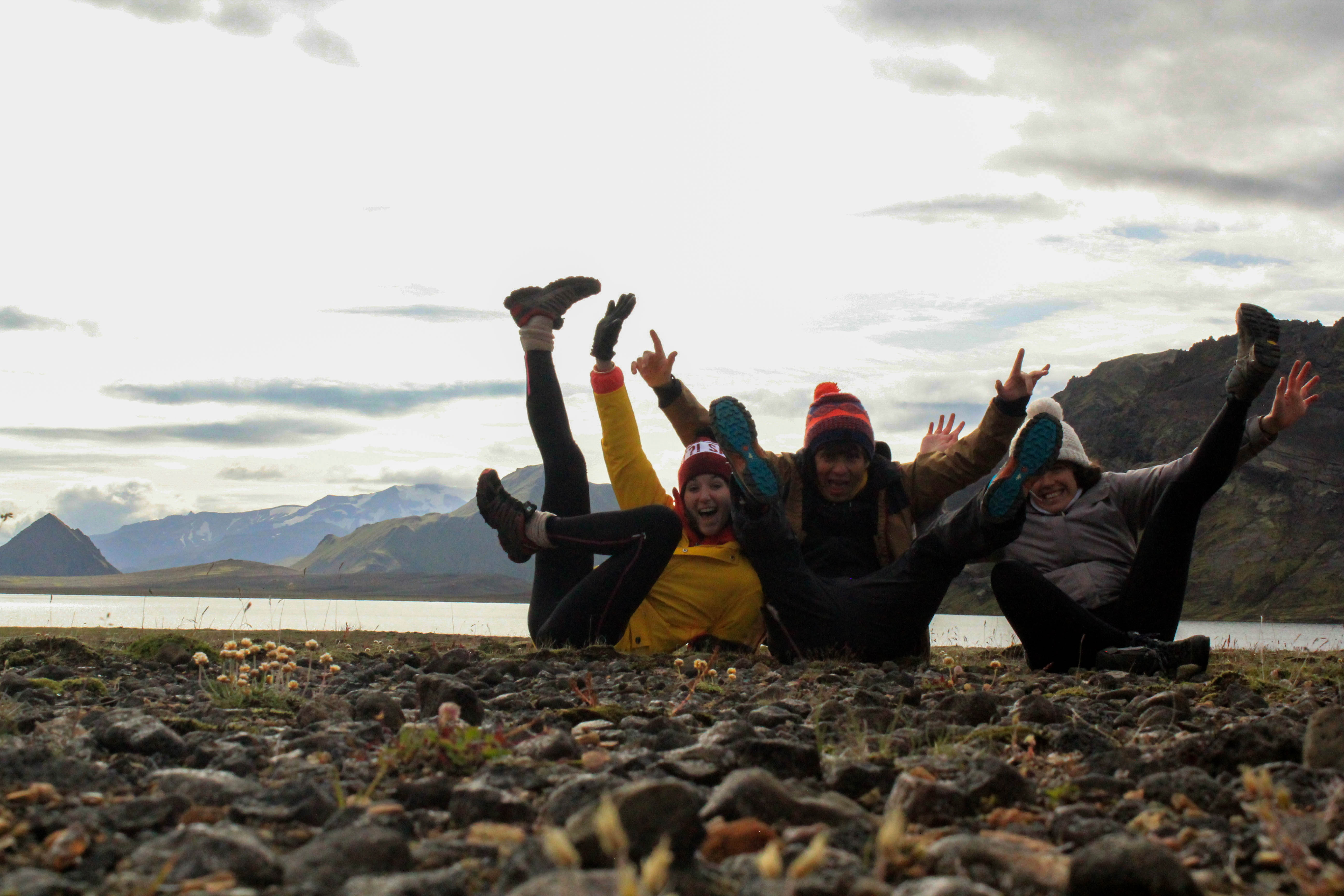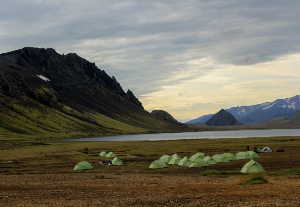 L’équipée s’élance. Les 1er pas foulent la vallée verdoyante de Þorsmörk. Entre ruisseaux glacés et hautes herbes. Très vite le sentier prend de la hauteur sur les collines rases. L’herbe disparaît. Cailloux et poussière deviennent nos compagnons de voyage sur cette nouvelle planète. Ca grimpe. Encore un dernier effort et notre troupe atteint le campement d’Ermstrur. Il y a quelques cabanes de bois. Et quelques tentes qui constellent le lit du ruisseau à la recherche d’une touffe d’herbe moelleuse à se mettre sous le matelas. Cette nuit, nous dormons sur Mars