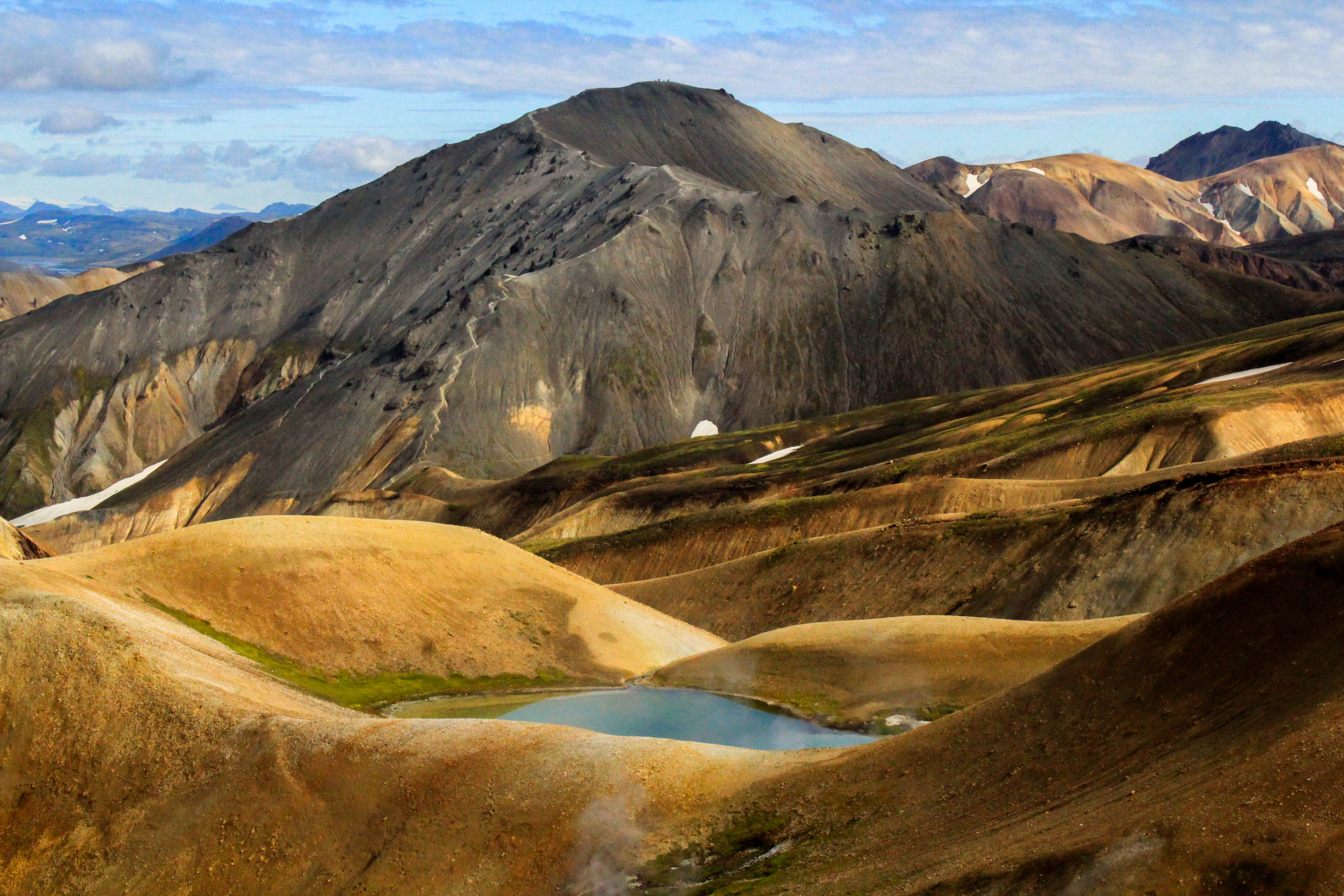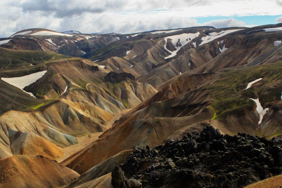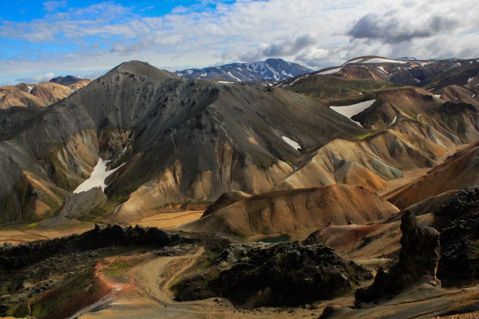 Au sud, un décor d’apocalypse, en camaïeu de noir, au milieu des volcans et des champs de lave. Seule explosion de couleurs à ce décor austère, les montagnes bariolées du Landmannalaugar.