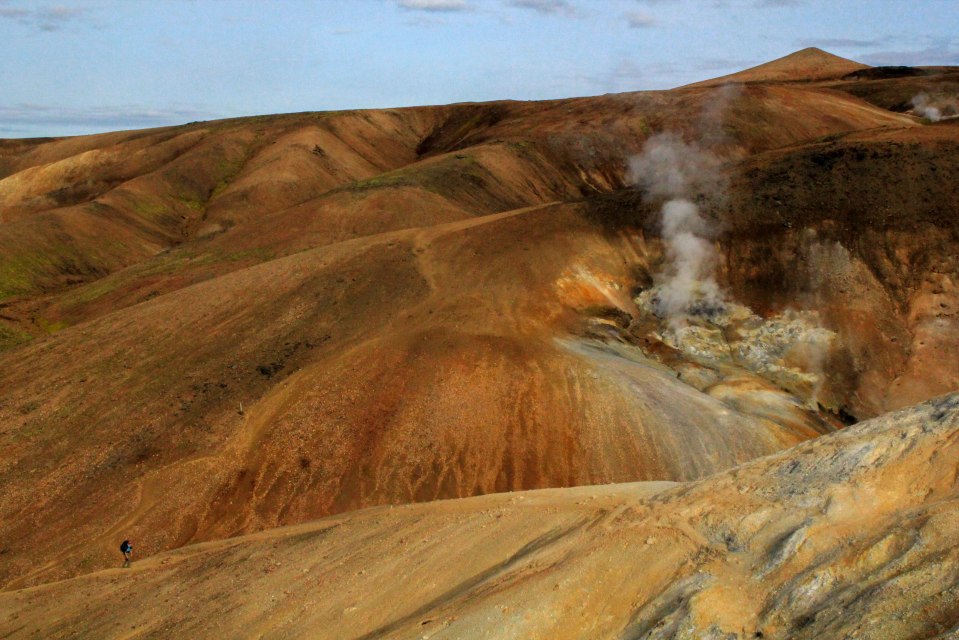 Le contraste n’en est que plus marqué avec ce qui suit. La redescente vers le dernier campement serpente entre 2 étranges montagnes Brennisteinsalda et Blàhniukur. L’une ocre. L’autre totalement noire. Et autour de nous, une explosion de couleur. Et comme une ombre à ce tableau fauviste, une coulée de lave noire, figée, épaisse, dégouline jusque dans la vallée. Notre équipée descend le long de cette ligne torturée jusqu’au point final de ce trek – Landmannalaugar. Fatigués. Les jambes lourdes. Mais émerveillés. On se jette dans les sources d’eau chaude.