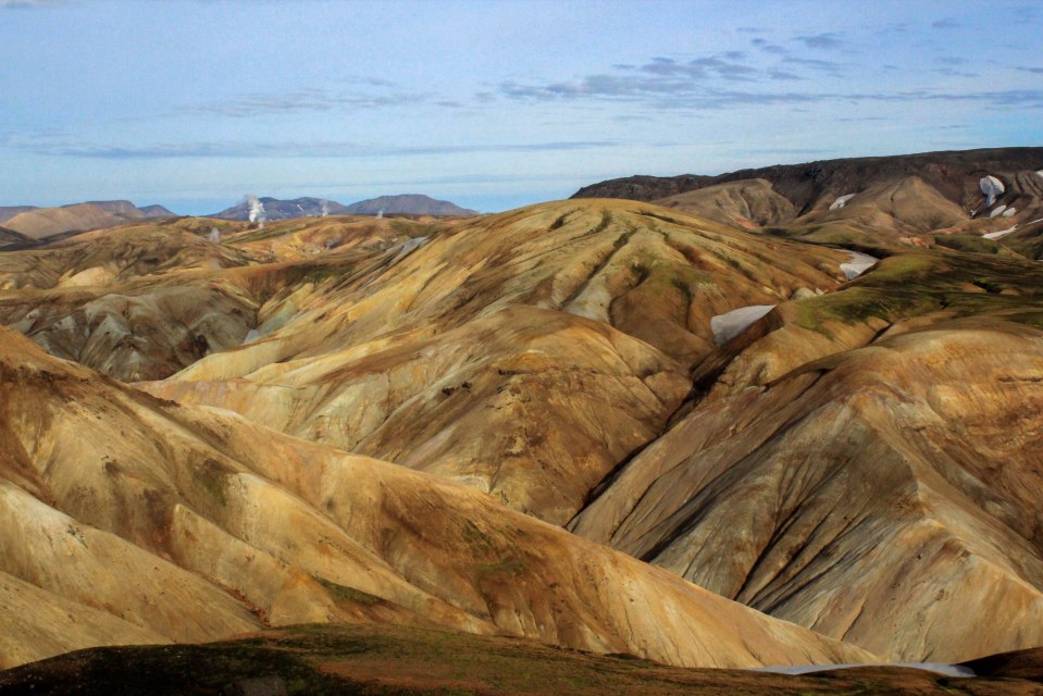 Notre équipée continue son avancée et grimpe dans les collines environnantes. On a l’impression de marcher sur une palette de couleurs. Des ocres. Des roches soufrées. Des coulées de geysers. Des pousses d’herbes vertes. Des névés paresseux… Et cette odeur de soufre qui nous suit comme une ombre.