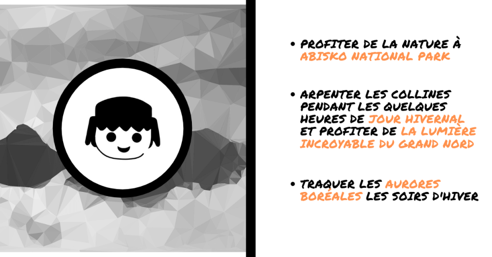 En hiver, la toundra rase est parée d’un doux manteau blanc. Vous pouvez espérer quelques heures de jour pour pouvoir explorer les environs raquettes ou skis aux pieds. Et pour les plus téméraires, partir à la recherche du Père Noël.