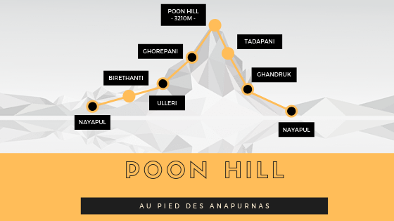 Le trek démarre à Nayapul, au fond de la vallée, entre rizières et ruisseaux, dans la moiteur de la verdure. La trace remonte ensuite la jungle épaisse et sombre à grands coups d’escaliers. Marche après marche, on se rapproche de Poon Hill. Les cuisses crissent.