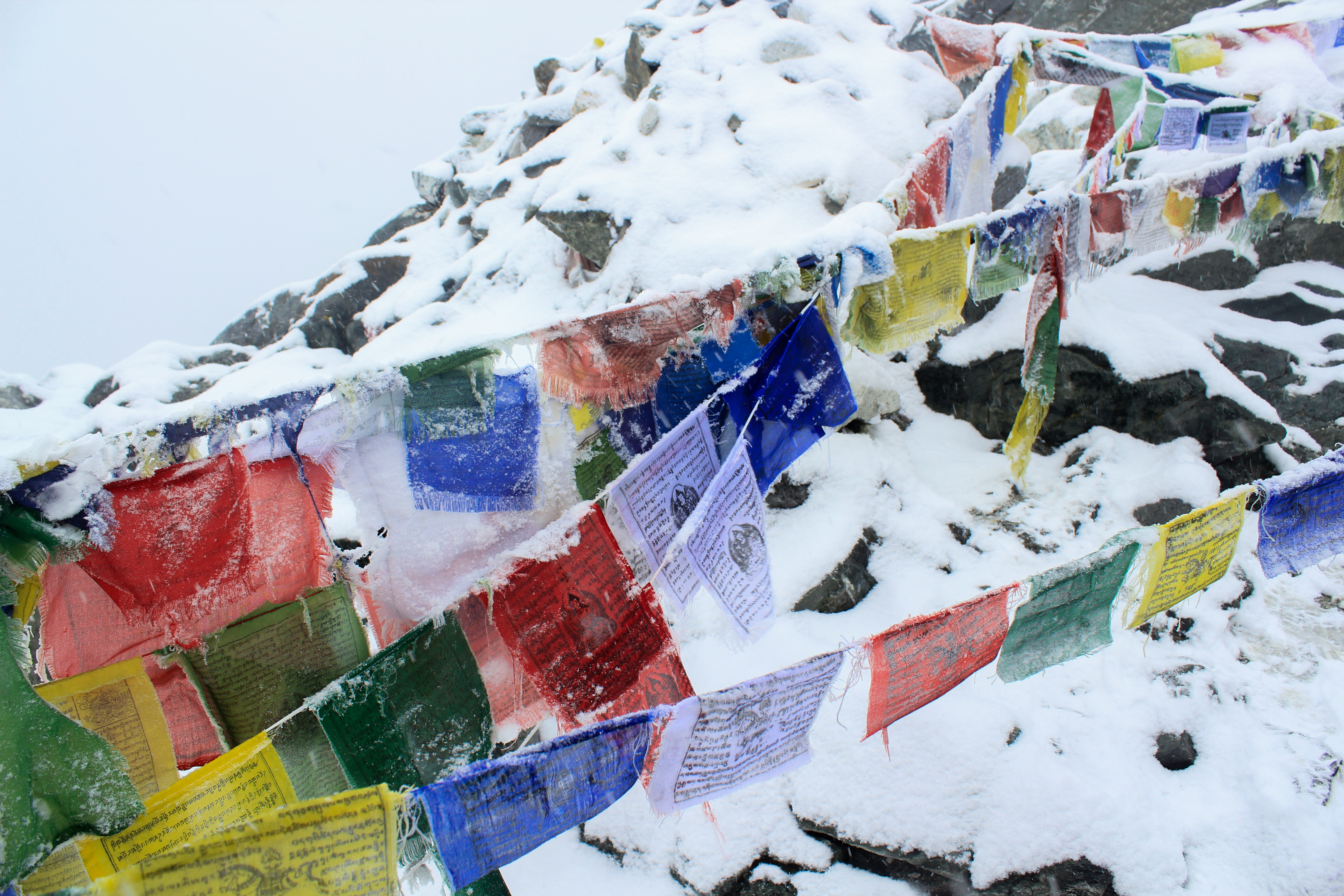 La suite de cette aventure nous a fait traverser le mythique col du Cho La Pass – 5400m – dans des conditions cotonneuses et humides, sous la tempête et la neige himalayenne. Nos poumons gelés et assoiffés d’oxygène.