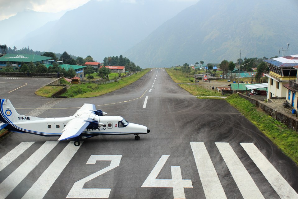 Pour la plupart d’entre nous, l’aventure a commencé dès le 1er jour avec le vol interne Katmandou – Lukla, véritable cauchemar des aérodromophobes. Seul moyen rapide pour atteindre le village perché de Lukla – 2800m – et s’éviter une marche d’approche de plusieurs jours depuis la capitale, ce trajet de haute voltige est une attraction en soit. La piste d’atterrissage en belle pente et parée d’un beau mur de pierre final finira de vous ravir.