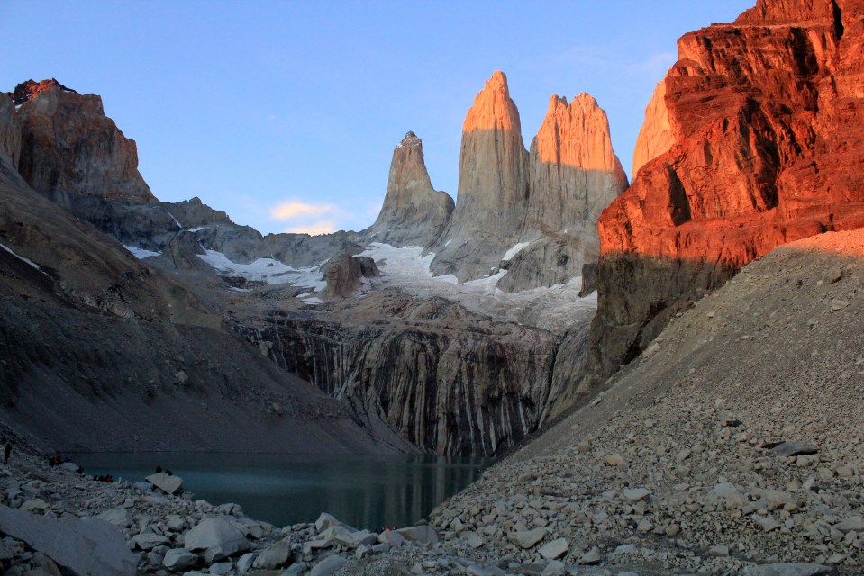 On y restera peu de temps. Au son des grillons, dans le calme de la nuit patagonienne, la troupe repart. Sous les étoiles chiliennes, on entame la montée au Mirador. On y arrivera à point nommé. Les 1ers rayons du soleil chatouillent les cîmes des Torres. Les embrasent. De rouge et de jaune. Transforment les eaux du lac en or. Tout le monde retient son souffle. Hypnotisés. Le spectacle est saisissant.