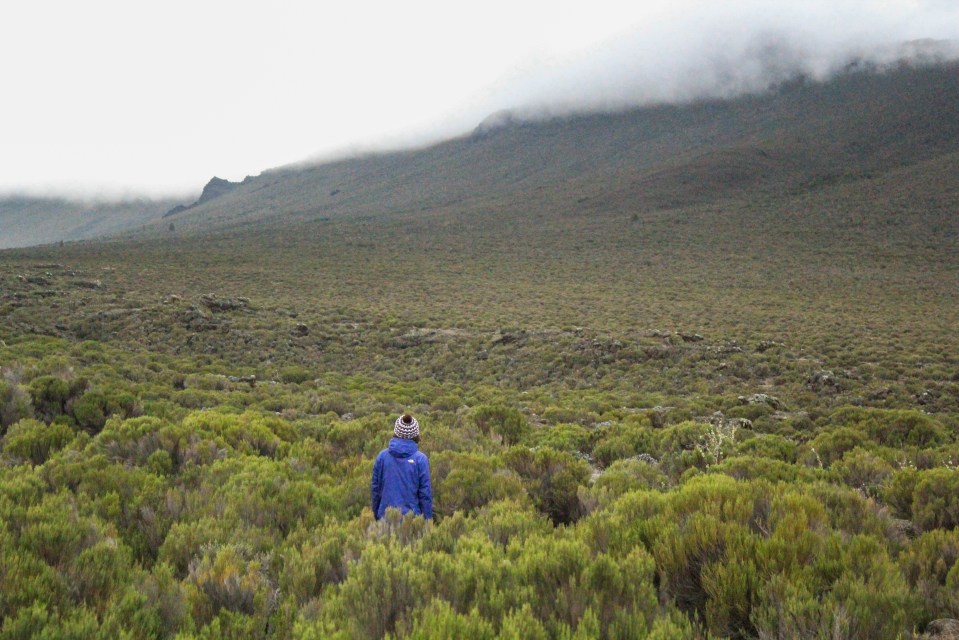 La forêt se raccourcit. S’assèche. On arrive au plateau de Shira. Ici, il n’y a plus que des arbustes et des pierres. A perte de vue. A perte de vent. Seul relief à ce décors, Kibo, sommet principal du Kilimandjaro. Notre objectif.