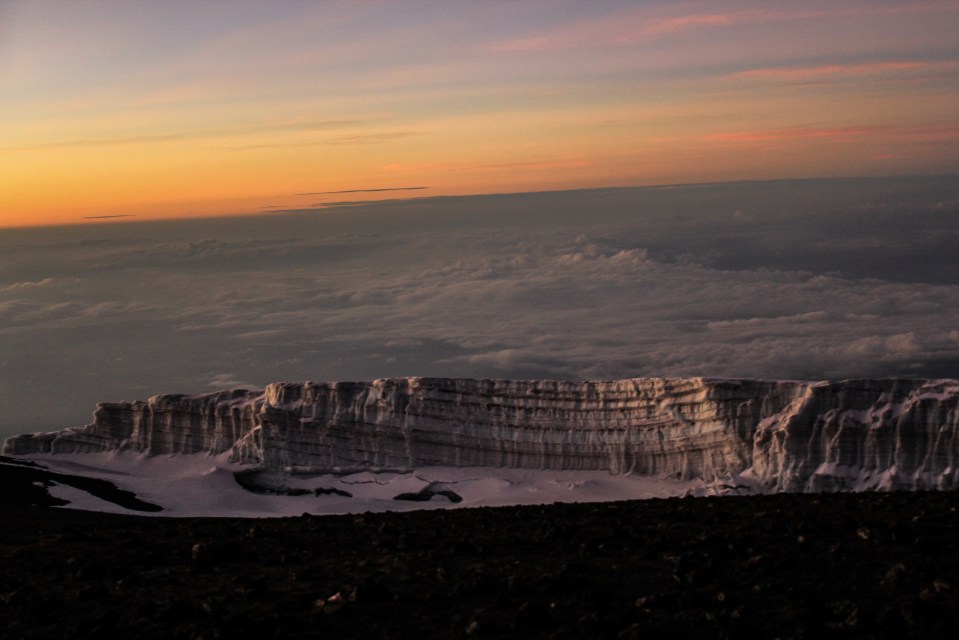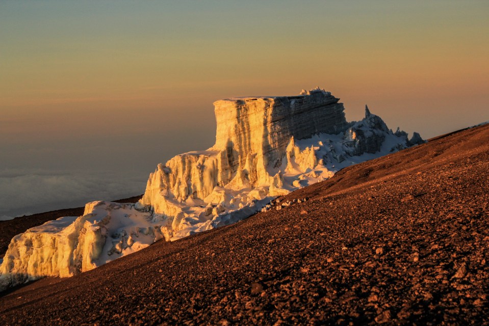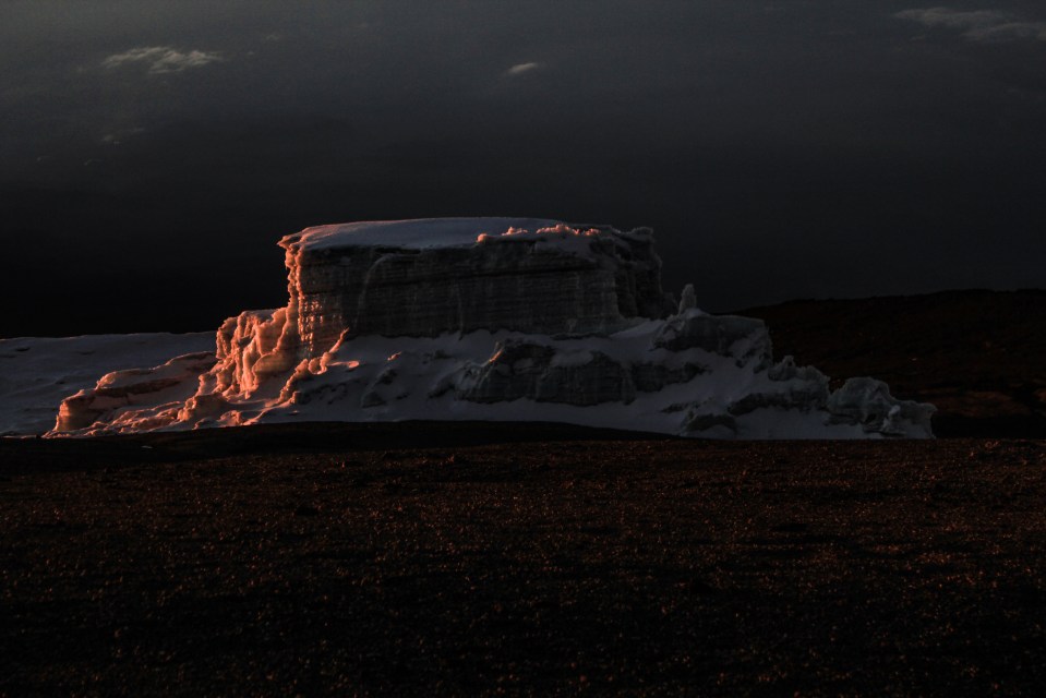 La magie remplace. Les 1ers rayons du soleil caressent le paysage. Et lèvent le voile sur ce qui nous entoure. Les neiges du Kilimandjaro. Enfin. Rêvées. Attendues. Espérées. Devant nos yeux s’animent les glaciers du sommet. Véritables paquebots échoués dans la poussière. Blocs de neige d’un autre temps. Oubliés. Ils inspirent le respect et la mélancolie. Combien de trekkeurs pourront-ils encore voir passer ? Combien de temps encore pour témoigner ?