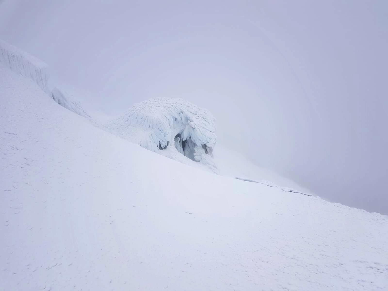 Dans le blanc infini du paysage, la silhouette du cône sommital se dessine. Immatériel. Mystérieux. Vaporeux. Rehaussé par l’odeur désormais tenace du soufre.