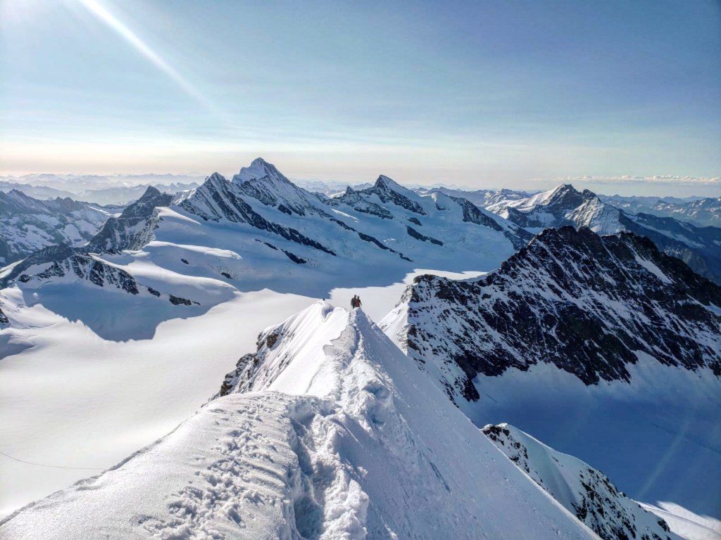 Col à 3463m entre les célèbres sommets oberlandais de la Jungfrau et du Mönch, le Jungfraujoch est surtout connu pour sa station ferroviaire la plus haute d’Europe qui traverse littéralement toute la paroi de l’Eigernordwand. Le promontoire rocheux abrite également la station scientifique Sphinx