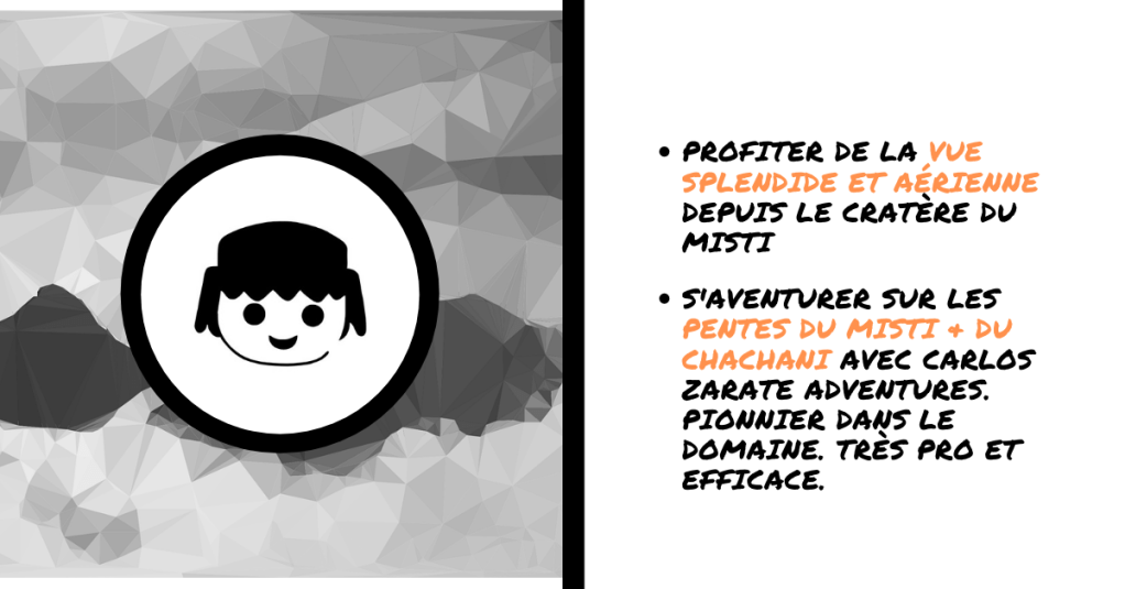 Il existe 2 voies pour accéder au sommet du Misti. La voie Sud. Et la variante Nord. La plupart des agences proposent la version Sud. Moins chère. Plus facile d’organisation . Et très raide. Personnellement, on vous recommande plutôt la version Nord. Plus progressive depuis le barrage hydraulique. Peu d’agences d’Arequipa proposent cette alternative, car elle nécessite un droit de passage payant au niveau du barrage. Si vous aussi vous êtes intéressés par cette option, on vous conseille de vous rapprocher de l’agence de Carlos Zarate. Un must d’Arequipa !