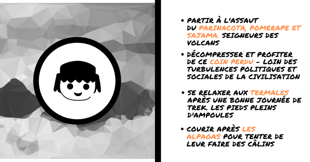 Parinacota. Pomerape. Sajama. Les 3 seigneurs vous attendent. Vous guettent. Pour une lutte sans merci pour le sommet. Pour les joyaux de leurs couronnes. Pour le trésor de leurs panoramas.