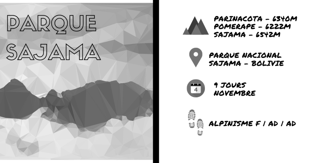 –Sajama (6542m) – ascension sous format d’expédition de 3 jours. Prévoir guide, cuisinier, porteurs et/ou mules. Matériel d’alpinisme obligatoire pour le dernier jour d’ascension. Entre goulotte de glace et glacier sommital.