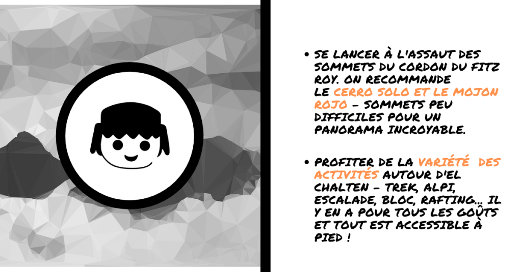 -Fitz Roy : symbole de la ville, il fut conquis pour la 1ère fois en 1952 par une expédition française menée par le célèbre Lionel Terray. Très esthétique, il possède en outre un granit exceptionnel qui en fait un objectif de rêve pour tous les alpinistes (très) confirmés.