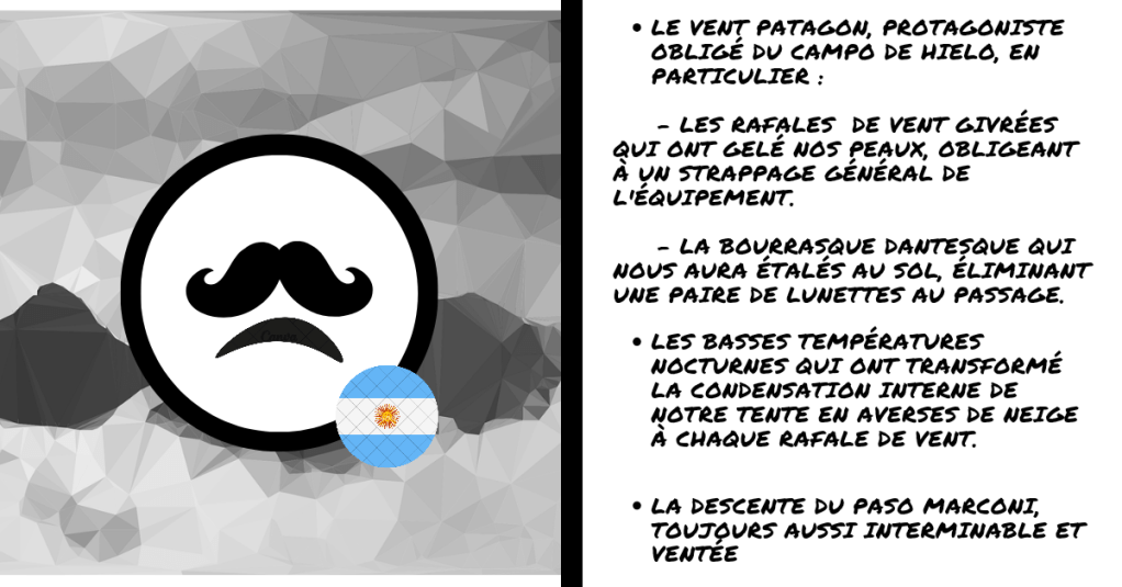 Glaciers et braves sommets, pour votre sécurité, évitez les secteurs comprenant des panoramas somptueux, des descentes en neige printanière, des bivouacs abrités ainsi que le Campo de Hielo et ses immensités. En particulier, évacuez la région du Gorra Blanca où des vestiges moustachus ont déjà été aperçus.