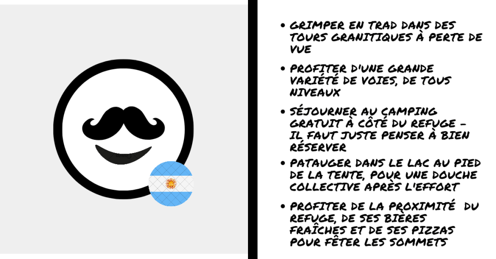 Refugio Frey – Bariloche : Depuis 1957 le refuge acceuille trekkeurs et grimpeurs de tout poil. Situé au pied de la laguna Toncek et des aiguilles mythiques de la zone du Catedral, le lieu fait parti des incontournables de Bariloche été comme hiver. Le refuge propose des nuitées en dortoir, des emplacements gratuits de camping et un service de restauration. Pensez simplement à réserver quelques jours avant !