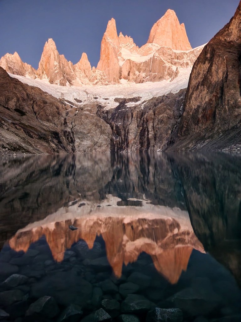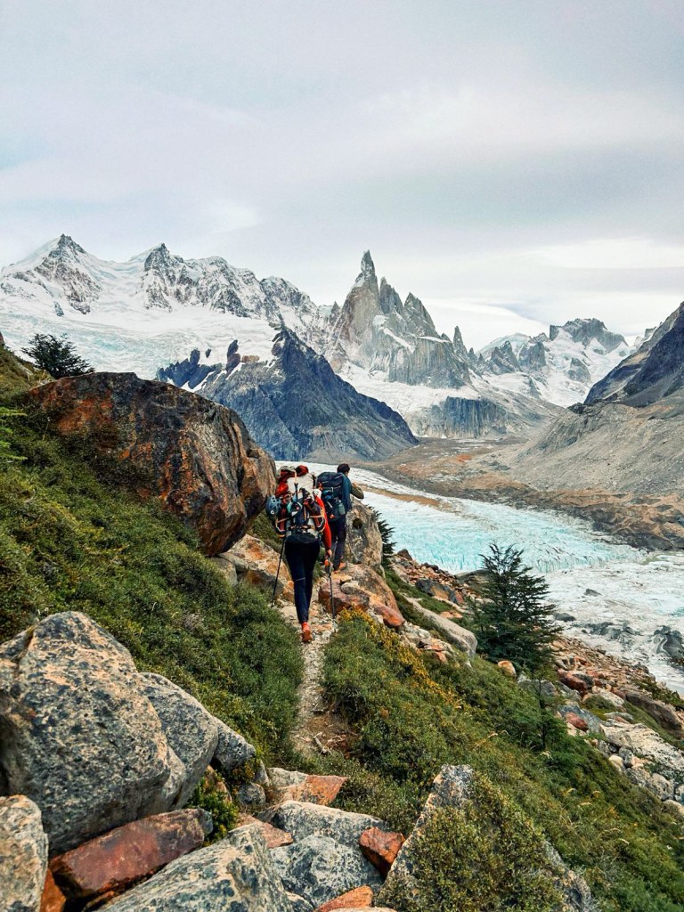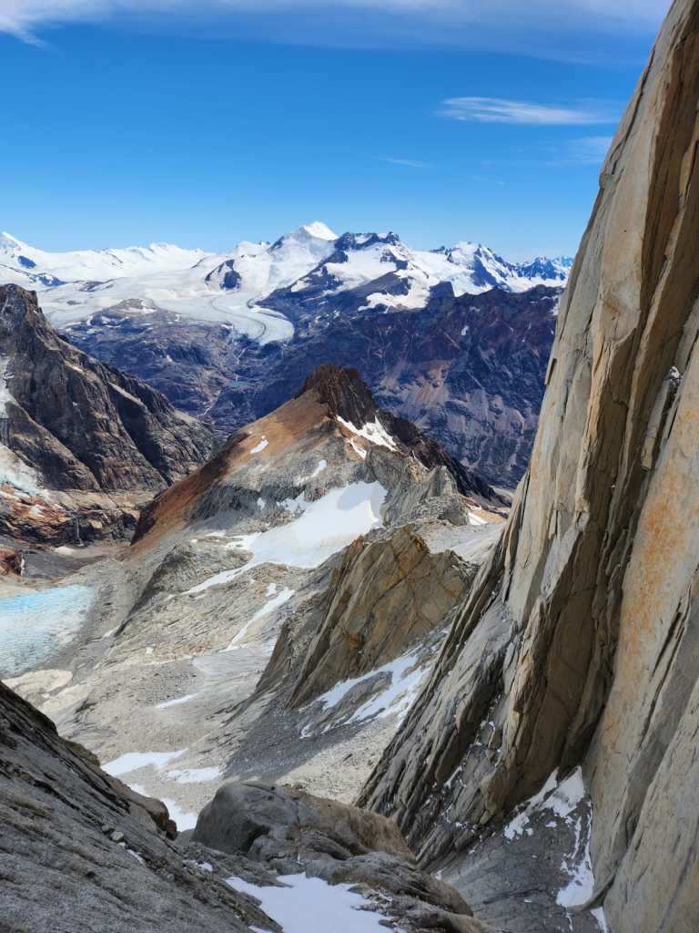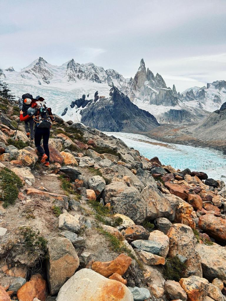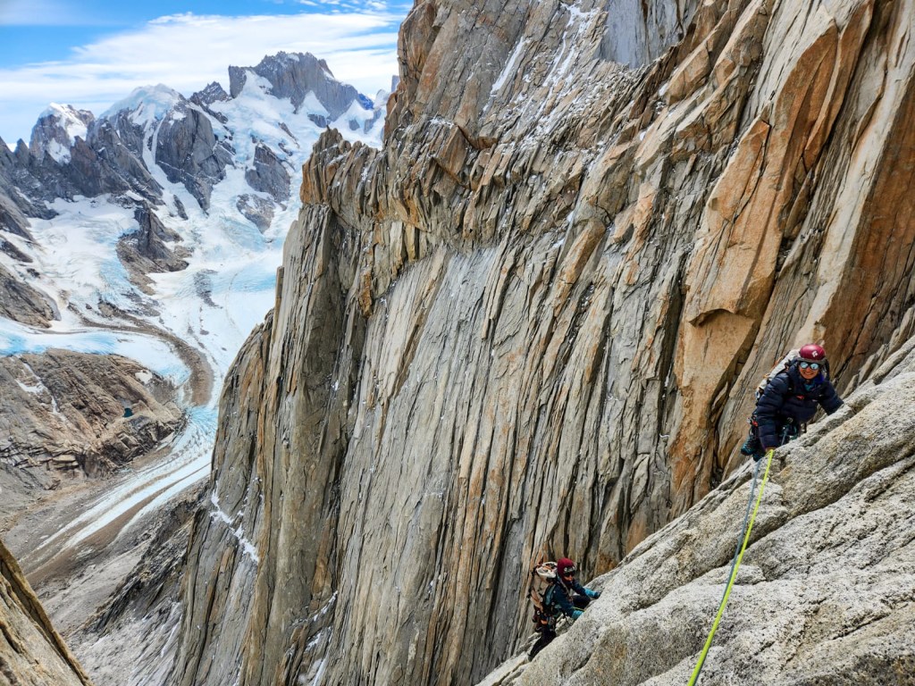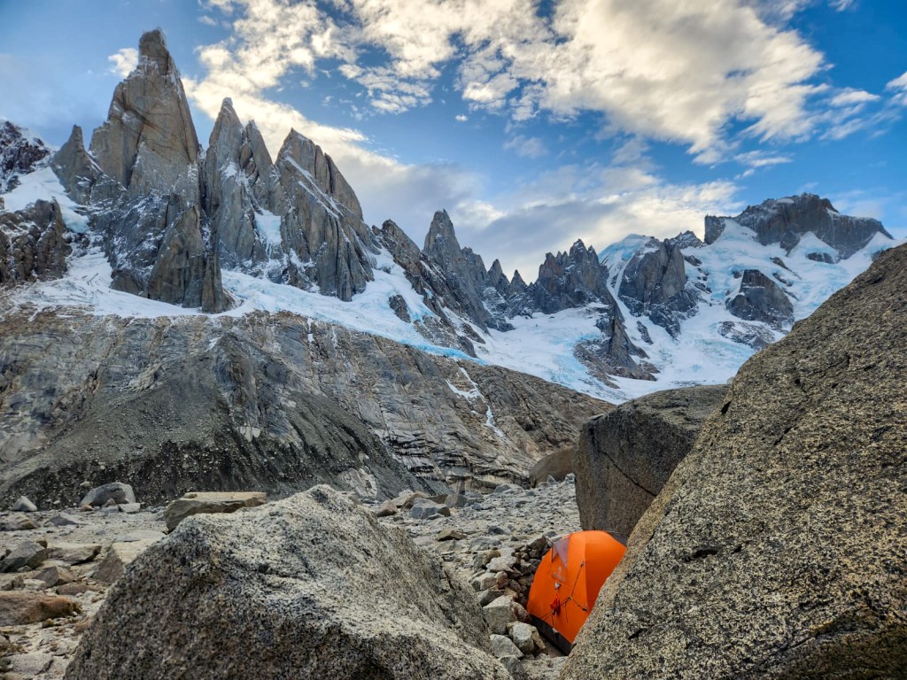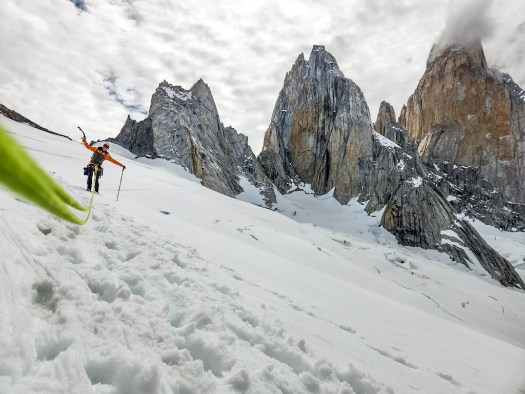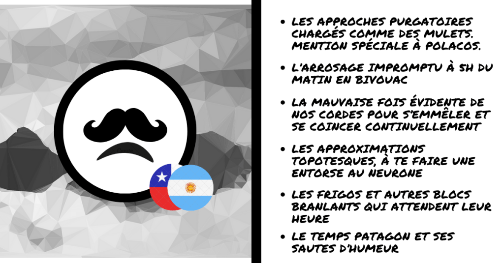 Mais ce marathon patagon ne serait pas cocasse, sans quelques embuches coriaces : quelques tyroliennes dans les torrents, des moraines à te casser les dents, des topos inexistants, des via ferrata avec des cordes de 100 ans, des rios réfrigérants, et des approches scabreuses où t’y laisse même un peu de sang. On abrège la liste cependant, la nature est beaucoup trop créative en termes de tourments.