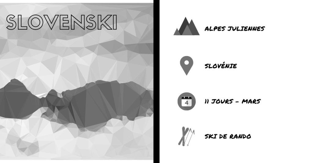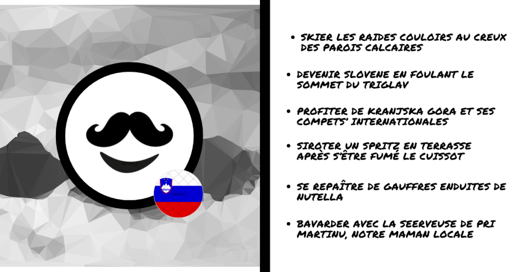 Lestés de goulash et de spritz savoureux, on est partis explorer ce pays à la recherche d’un ursidé ou deux. De Bled au Triglav dans les massifs montagneux, on a sillonné sans relâche ce nouveau terrain de jeu. Rencontré quelques bosquets un poil foireux. Zippé sur du verglas facétieux. Skié dans des couloirs ma foi scabreux. Traversé des fils de crêtes pas mal gazeux. Transpiré et sué comme de beaux gueux. Découvert des remix à l’accordéon douteux. Partagé une soirée avec des météorologues un peu taiseux. Injurié maintes fois le manteau neigeux. Profité des panoramas prodigieux. Bref on en a pris pleins les cuissots et les yeux.